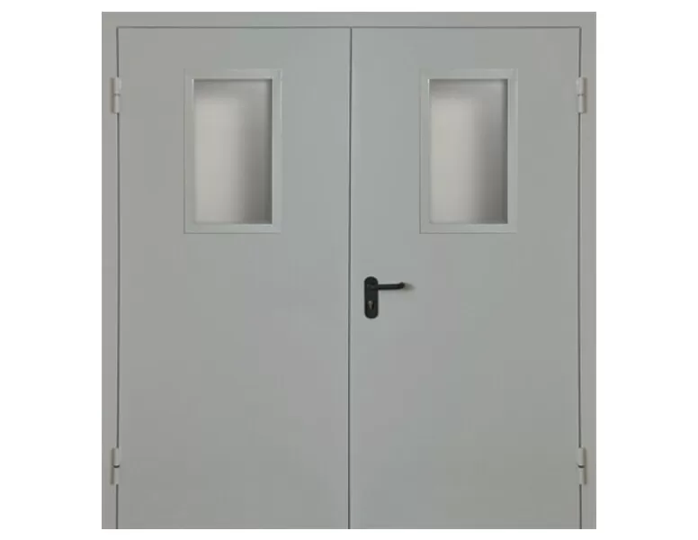 Двухстворчатая огнестойкая дверь EI 60 с выпадающим порогом и стеклом
