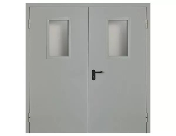 Двухстворчатая огнеупорная дверь EI 60 с выпадающим порогом, стеклом и решеткой