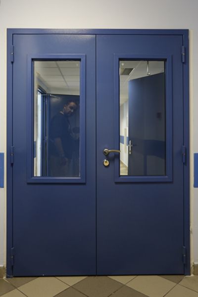 Противопожарная алюминиевая дверь синего цвета в Ступино